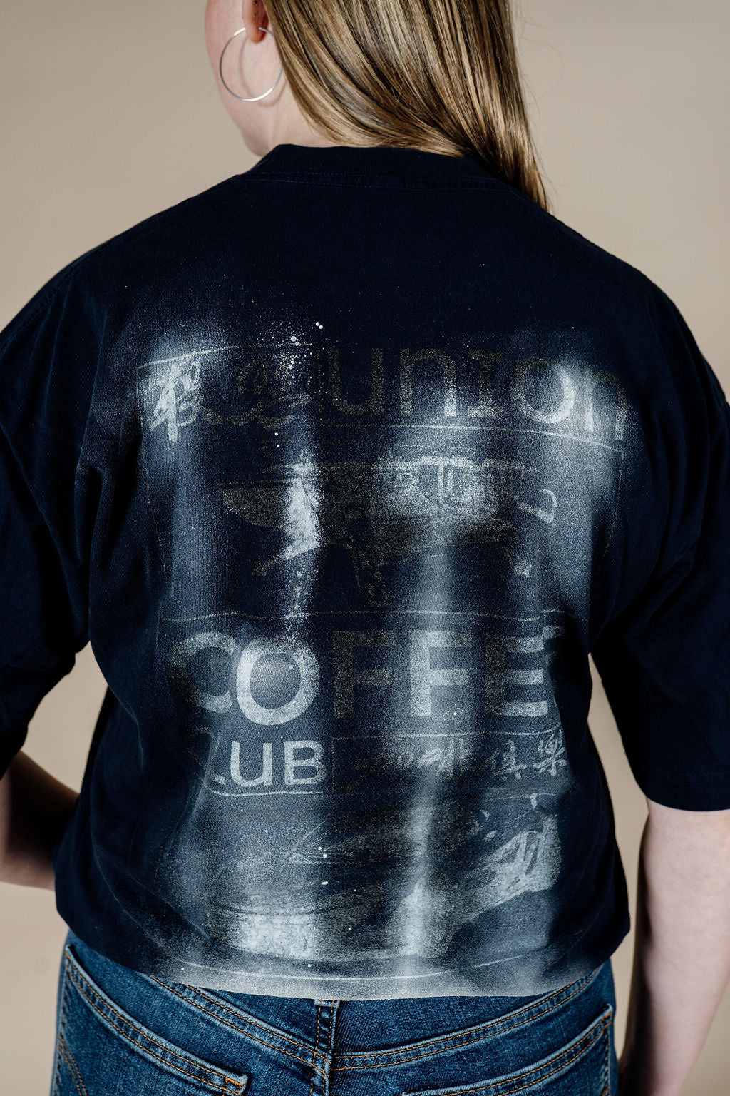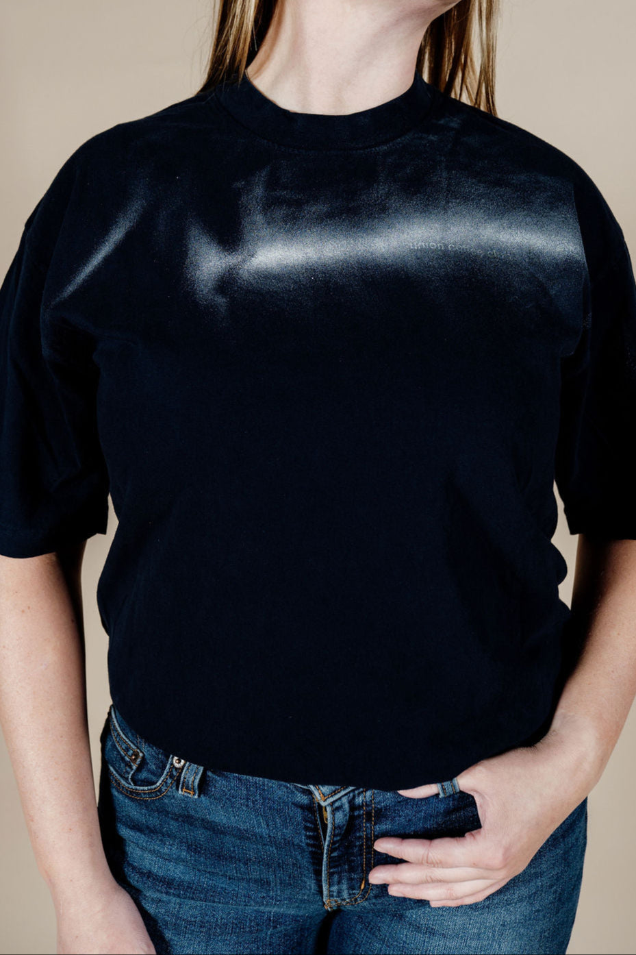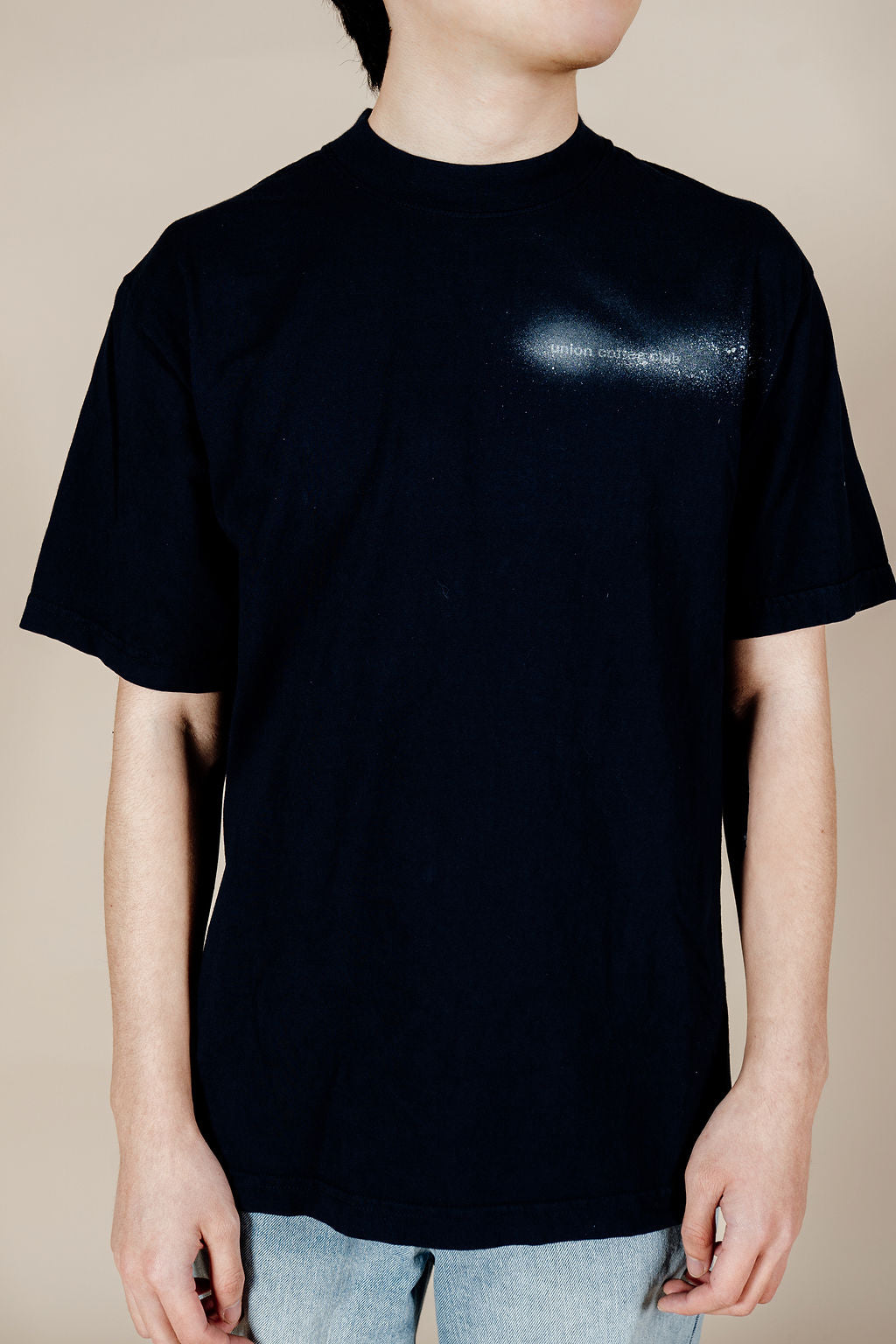 Navy t-shirt with printed front and back graphics. Each shirt has a unique spray pattern to reveal the graphic.